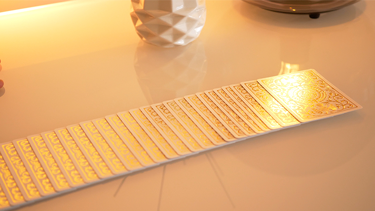 The box is made from two protective pearlized white casings, with an inner and outer cellophane wrap. These individually gold-foiled cards are sealed to withstand any extreme heat or humidity during shipment. Our priority for the Regalia series has always been quality. Each card has been carefully hot stamped with gold foil and then protected with a true B9 finish, thus to not compromise the feel and fluidity with each shuffle or flourish.